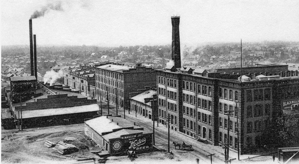 As Durham’s economy took off during the Industrial Revolution, Blackwell and Carr’s tobacco and cloth-and-bag-making output grew rapidly. By 1900, Golden Belt had 48 machines producing 15,000 bags each day (up to 2 million per month). As Golden Belt automated, it also diversified, adding sacks of flour, cornmeal, and salt to its offerings.